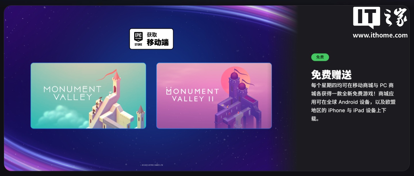 12 月 26 日 信息,Epic 移动游戏商城今天 宣告限时免费赠送《 留念碑谷》和《 留念碑谷 2》,安卓端消费者和欧盟 iOS 端消费者 能够 领取 玩耍 。