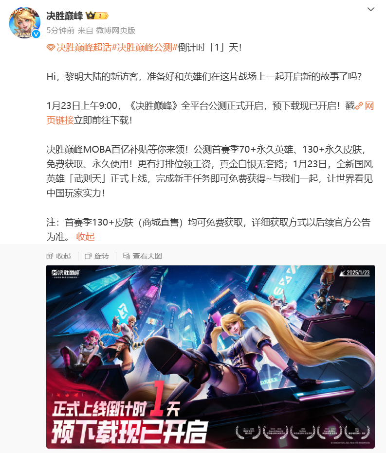 1 月 22 日 信息,由上海沐瞳科技有限公司开发的 MOBA 游戏《决胜高峰》官宣国服今天 9:00 开启预下载,明日同步登陆安卓 / iOS / 鸿蒙原生平台开启公测 。